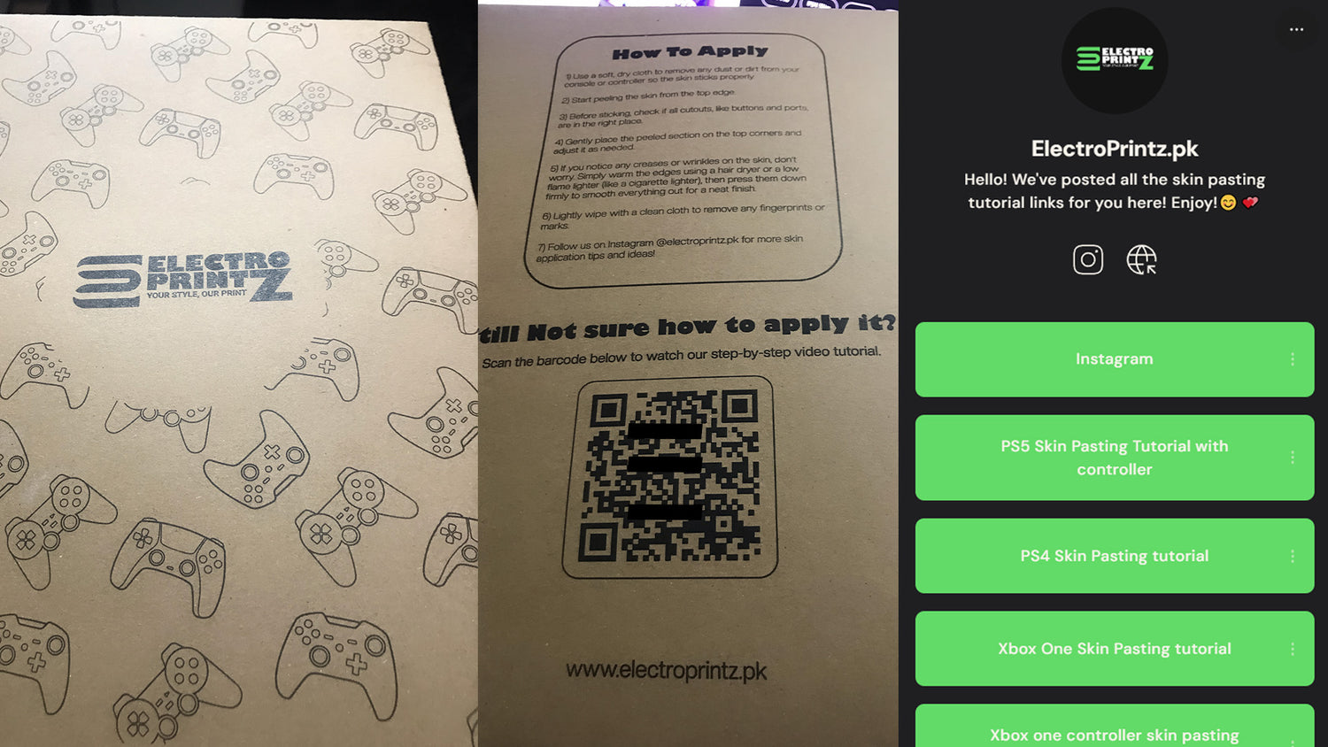 All skin pasting tutorials can be found out at the back of the packaging box, Just scan the QR code, open the link, find your console type and watch the tutorials!